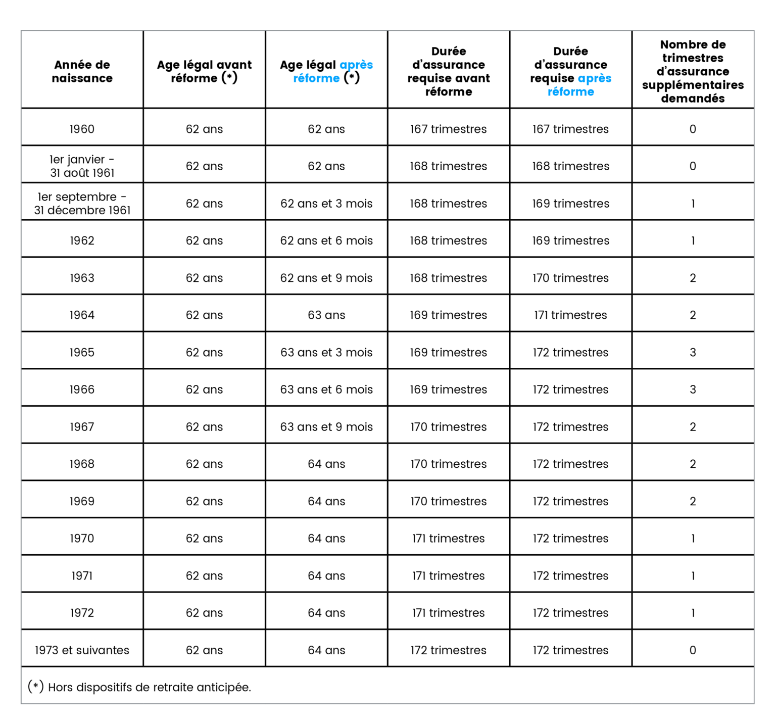La réforme des retraites 2023 relève donc, progressivement l’âge légal de départ à la retraite de 62 à 64 ans, à raison de 3 mois par génération, à compter de celle née à partir de septembre 1961. Dans le même temps, ce décret du 3 juin 2023, accélère le passage de la durée de cotisations déjà en cours : le rythme initial d’un trimestre tous les 3 ans, passe désormais à un trimestre tous les ans !